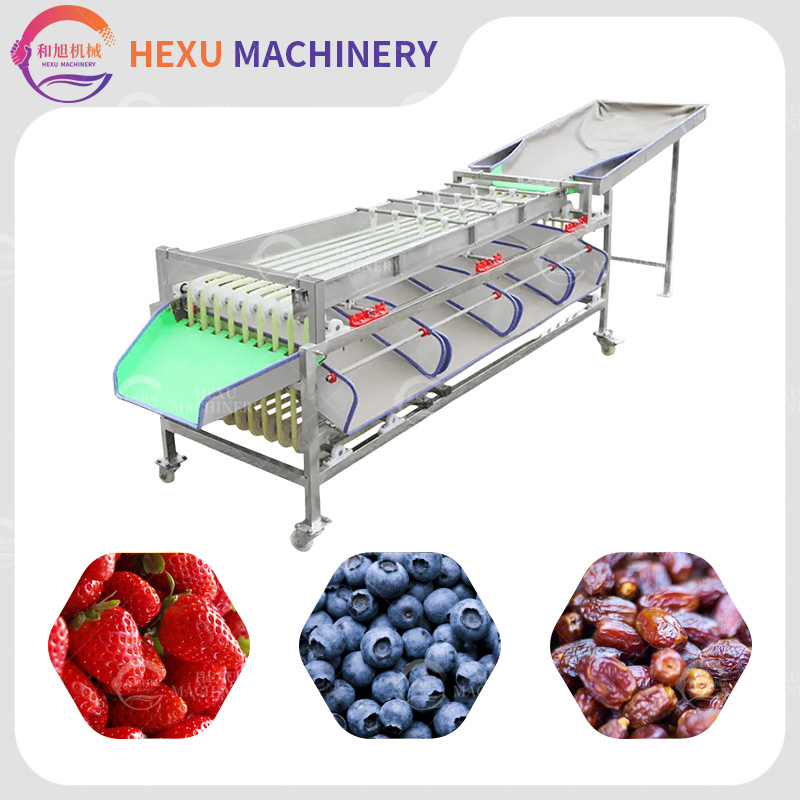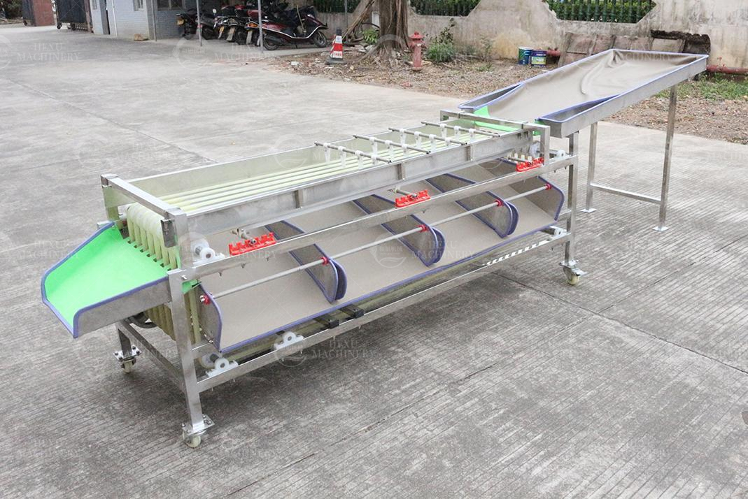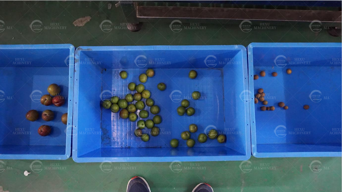 本机用于樱桃、圣女果、荔枝、李子等小型的圆形果蔬的分选分级。根据物料的硬度,我们可以采用料斗出口和输送带出口两种不同的方式。